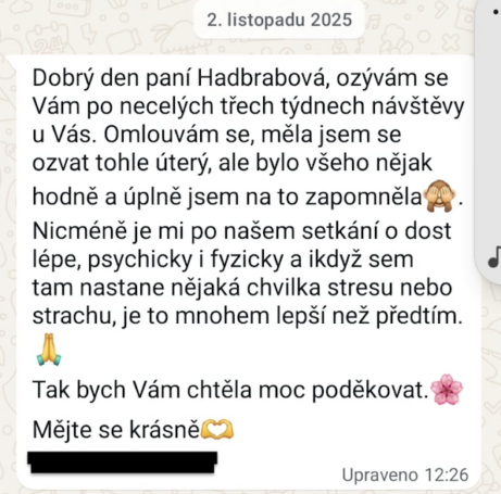 Účinky terapie jsou stejné, ať mluvíme on-line nebo osobně. Ale osobní prožitek návštěvy umocňuje změny v energiích a přidává hloubku. Proto pokud je to možné, doporučuji osobní návštěvu. Nicméně pokud je to daleko, využijeme moderních prostředků a uvidíme se přes WhatsApp. Na terapii mám vždy vyhrazeno 90 minut.